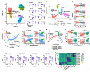 在基質(zhì)室中,作者鑒定了三種主要的細(xì)胞類型(圖5a,b)。Monocle2的偽時(shí)間軌跡分析揭示了5種CAF狀態(tài)。狀態(tài)1(s1)具有高表達(dá)的間充質(zhì)干細(xì)胞(MSCs)和炎性樣CAFs (iCAFs)特征。當(dāng)細(xì)胞向分化狀態(tài)s4和s5過渡時(shí),這些標(biāo)記物的表達(dá)減少,這種分化狀態(tài)通過增加ACTA2 (aSMA)、TAGLN、FAP和COL1A1的表達(dá)和富集ECM相關(guān)通路而類似于肌成纖維細(xì)胞樣CAF狀態(tài)。