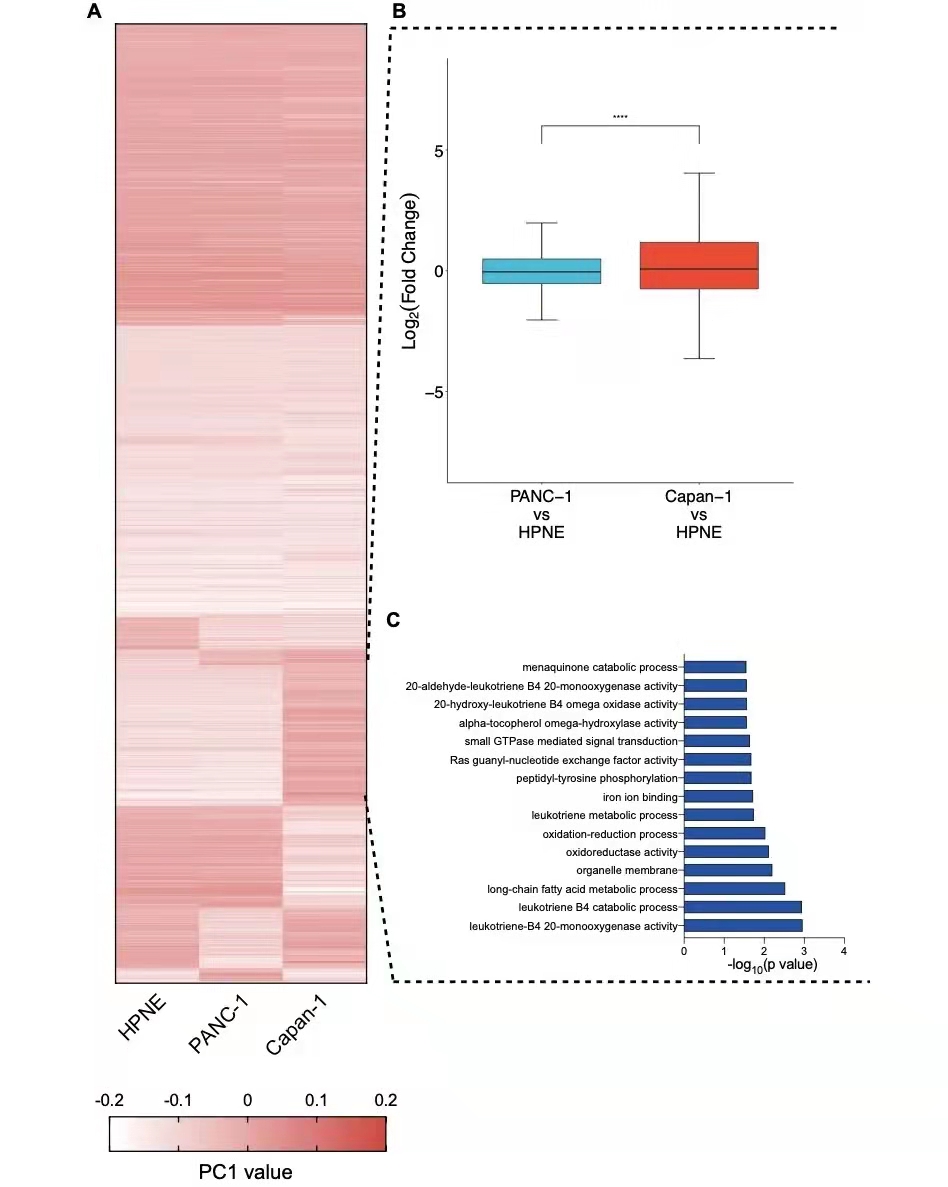 作者對(duì)Compartment利用PC1值進(jìn)行聚類(lèi)分析,以確定正常和原發(fā)癌細(xì)胞的B區(qū)室轉(zhuǎn)變?yōu)檗D(zhuǎn)移癌細(xì)胞的A區(qū)室(圖1a),并且位于這些區(qū)室中的基因表現(xiàn)出更高的表達(dá)(圖1b)。GO富集分析結(jié)果顯示,這些基因富含Ras/small GTPase 、 oxidation–reduction term,而這些是胰腺癌進(jìn)展所必需的。這些結(jié)果提示,Compartment重排可能促進(jìn)胰腺癌的轉(zhuǎn)移。