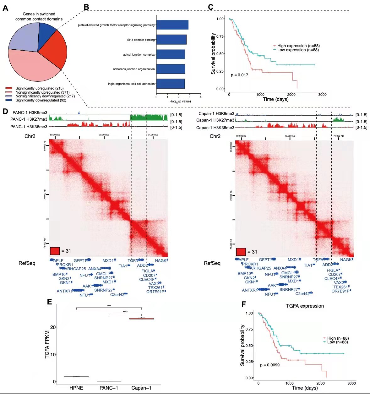 接下來(lái),作者重點(diǎn)關(guān)注原發(fā)性和轉(zhuǎn)移性癌細(xì)胞之間的共同結(jié)構(gòu)域。提取了位于共同結(jié)構(gòu)域中的基因,發(fā)現(xiàn)這些基因中的大多數(shù)在轉(zhuǎn)移癌樣本中上調(diào),并且GO分析顯示顯著上調(diào)的基因(log2FC≥ 1和調(diào)整p值≤ 0.05)在血小板衍生生長(zhǎng)因子受體信號(hào)通路中富集(圖3b)。此外,作者利用TCGA胰腺癌患者隊(duì)列的基因表達(dá)數(shù)據(jù)和長(zhǎng)期隨訪數(shù)據(jù)來(lái)確定這些基因的表達(dá)與患者生存率之間的相關(guān)性。分析表明,這些基因的高表達(dá)顯著降低了患者的生存率(p=0.0175,對(duì)數(shù)秩檢驗(yàn))(圖3c)。例如,TGFA基因,位于原發(fā)癌富集H3K27me3的結(jié)構(gòu)域中,但位于轉(zhuǎn)移癌的富集H3K36me3的結(jié)構(gòu)域中。而這個(gè)基因的高表達(dá)顯著降低了患者的生存周期(圖3f)。也就是說(shuō),共同結(jié)構(gòu)域中的染色質(zhì)狀態(tài)改變也可促進(jìn)胰腺癌轉(zhuǎn)移。