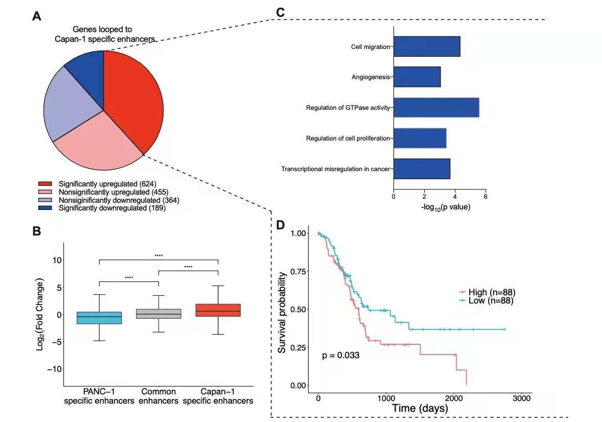 通過(guò)loop環(huán)的分析,loop數(shù)量與TAD總體趨勢(shì)類(lèi)似,在轉(zhuǎn)移細(xì)胞癌中顯著增加。與原發(fā)癌細(xì)胞相比,大多數(shù)啟動(dòng)子與Capan-1特異性增強(qiáng)子成環(huán)的基因表達(dá)上調(diào),同時(shí),這些基因的表達(dá)水平明顯高于與PANC-1特異性增強(qiáng)子連接的基因。作者對(duì)顯著上調(diào)基因富集分析發(fā)現(xiàn):這些基因在細(xì)胞遷移和血管生成方面顯著富集(圖4c),表明這些基因與胰腺癌轉(zhuǎn)移相關(guān);而且生存分析發(fā)現(xiàn),這些基因的高表達(dá)與不良預(yù)后顯著相關(guān)(圖4d)。這些結(jié)果表明,胰腺癌轉(zhuǎn)移過(guò)程中環(huán)的變化可上調(diào)轉(zhuǎn)移相關(guān)基因。