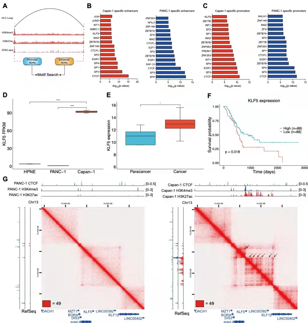 在證明轉(zhuǎn)移特異性增強(qiáng)子的基因環(huán)與胰腺癌轉(zhuǎn)移相關(guān)后,作者想知道哪些因素有助于這些增強(qiáng)子啟動(dòng)子環(huán)的形成。作者整合了ATAC-seq數(shù)據(jù),分析了轉(zhuǎn)移癌中參與增強(qiáng)子啟動(dòng)子成環(huán)的特異性增強(qiáng)子,確定TFs的motif,如SP1、EGR1和KLF5(圖6b)。相反,參與增強(qiáng)子啟動(dòng)子成環(huán)的原發(fā)性胰腺癌特異性增強(qiáng)子的TFsmotif,如E2F1、MAZ和ZFX(圖6b)。位于相應(yīng)啟動(dòng)子的的這些motif分析結(jié)果與位于細(xì)胞類(lèi)型特異性增強(qiáng)子的motif分析結(jié)果相似(圖6c)。值得注意的是,所有NDR都有CTCF和CTCFL motif,這與CTCF是介導(dǎo)染色質(zhì)環(huán)的重要染色質(zhì)結(jié)構(gòu)蛋白這一事實(shí)一致。