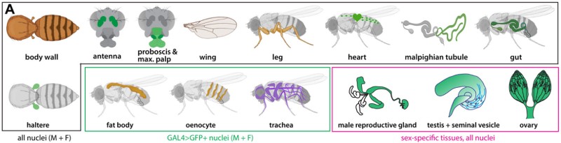 實(shí)驗(yàn)方法:解剖了來(lái)自雌性和雄性黑腹果蠅的12個(gè)組織(觸角、體壁、脂肪體、平衡棒、心臟、腸道、腿、馬氏管、絳色細(xì)胞、喙和下顎須、氣管、翅膀)以及3個(gè)性別特異性組織(雄性生殖腺、睪丸、卵巢)。對(duì)于遍布全身的組織使用特異性GAL4驅(qū)動(dòng)核-GFP蛋白,再用流式細(xì)胞熒光分選技術(shù)標(biāo)記和收集細(xì)胞核,進(jìn)行單細(xì)胞核snRNA-seq