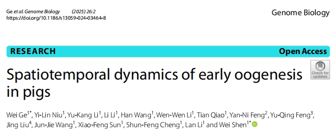 2025年1月,青島農(nóng)業(yè)大學(xué)葛偉教授與沈偉教授團(tuán)隊(duì)在學(xué)術(shù)期刊《Genome Biology》上發(fā)表了一篇題為《Spatiotemporal dynamics of early oogenesis in pigs》的研究論文。該研究利用了單細(xì)胞RNA測(cè)序和空間轉(zhuǎn)錄組技術(shù),解析了豬早期卵子發(fā)生中的基因表達(dá)及空間組織特征。研究發(fā)現(xiàn),豬生殖細(xì)胞在卵巢中呈“皮質(zhì)到髓質(zhì)”分布,且與人類卵子發(fā)生過(guò)程相似,表明豬是研究人類卵子發(fā)生的良好模型。RNA速度分析揭示了顆粒細(xì)胞譜系特征,空間共定位分析和細(xì)胞通訊分析顯示皮質(zhì)與髓質(zhì)區(qū)域生殖細(xì)胞與體細(xì)胞通訊模式不同,特別是NOTCH信號(hào)通路和ECM蛋白在調(diào)控中起關(guān)鍵作用,強(qiáng)調(diào)了卵巢微環(huán)境對(duì)生殖細(xì)胞命運(yùn)的重要性。