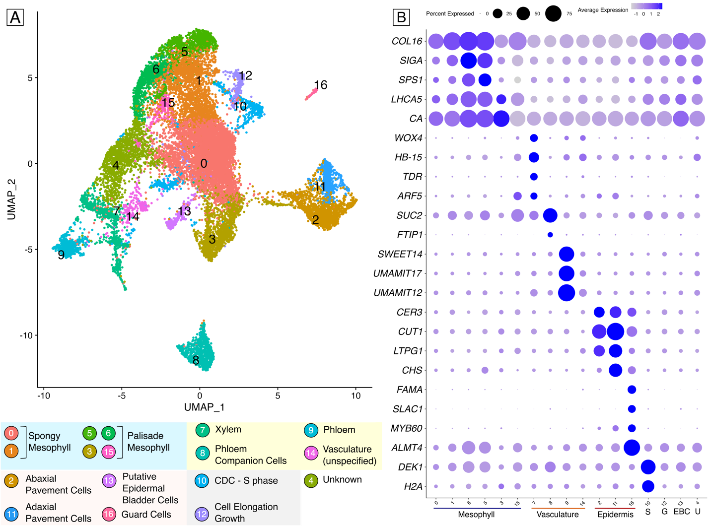 單細(xì)胞核測序:共獲取17,994個高質(zhì)量核,注釋17個細(xì)胞簇,覆蓋葉肉(海綿/柵欄)、表皮、保衛(wèi)細(xì)胞、木質(zhì)部、韌皮部等
