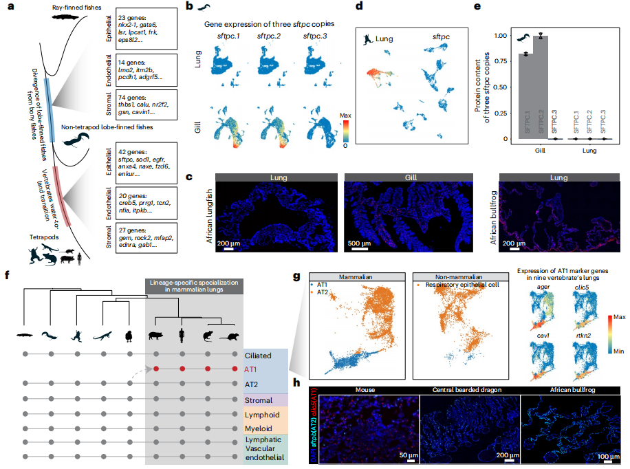 ③ 全基因組復(fù)制對肺演化很重要,1866個肺相關(guān)直系同源基因中有776個是脊椎動物兩輪全基因組復(fù)制(2R-WGD)的產(chǎn)物;哺乳動物譜系特異的基因復(fù)制也十分重要,sfta2-/-小鼠表現(xiàn)出明顯的呼吸疾病,包括顯著的炎癥。