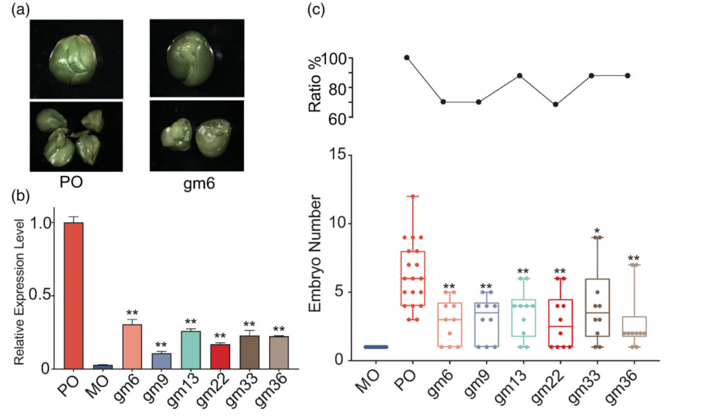 FhRWP基因在胚囊中的表達是特異性和短暫的,可以從受精前7天開始追蹤,直到后10天,作者采用RNAi方法構建了6個干擾系,發(fā)現(xiàn)FhRWP在6個干擾系中的表達量相比PO系顯著降低,但顯著高于Mo基因型,且FhRWP表達量降低后不定胚數量也都減少了,這些結果提示,受FhRWP控制的不定胚表型可能與基因表達的劑量效應有關。