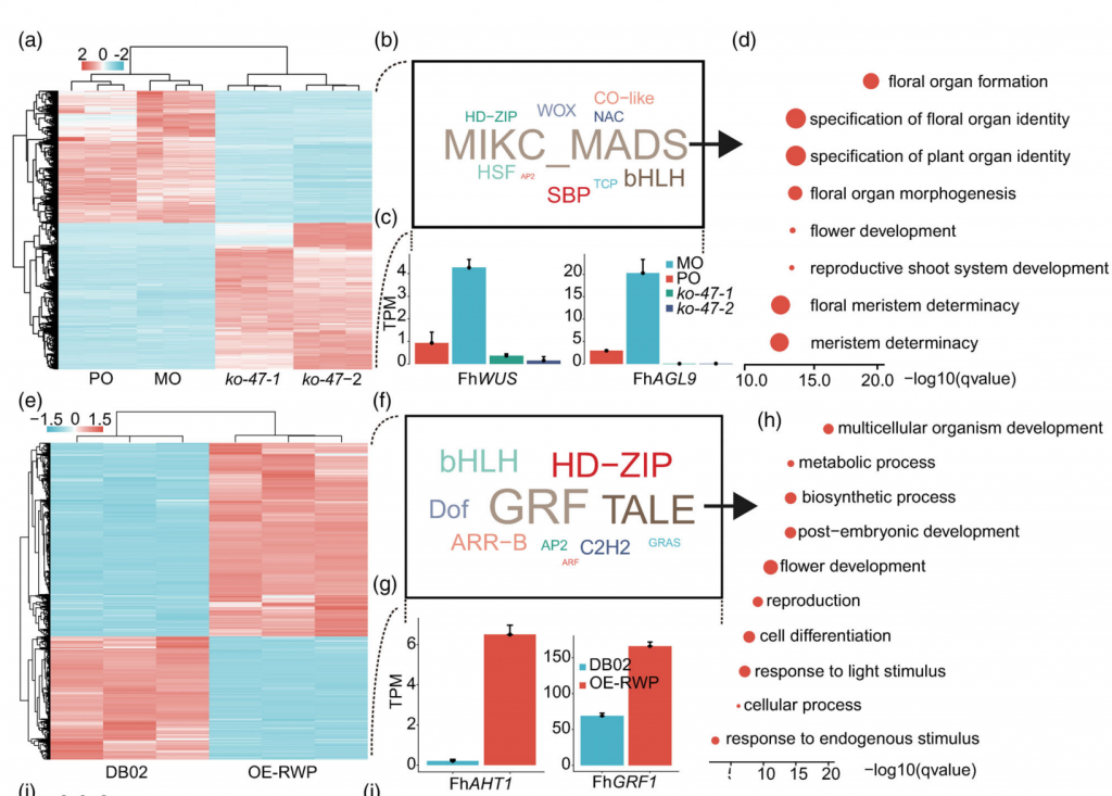 多項實驗結果表明,F(xiàn)hRWP在協(xié)調細胞命運和啟動植物再生和繁殖過程中起著關鍵作用,因此,該研究對腋芽MO/PO胚珠的表達數據進行了整合的轉錄組分析。差異基因在花器官發(fā)生和繁殖相關的生物過程顯著富集,其中來自MADS和WOX等基因家族的轉錄因子,包括FhWUS和FhAGL6,均顯著富集,在過表達的愈傷組織中,共鑒定出354個差異表達的轉錄因子,GO注釋顯示與胚胎后發(fā)育和再生相關的過程顯著相關。值得注意的是,屬于GRF和TALE等基因家族的轉錄因子,包括FhAHT1和FhGRF1,表現(xiàn)出顯著的富集,這些基因已被廣泛報道參與光形態(tài)建成、葉片發(fā)育等信號通路。