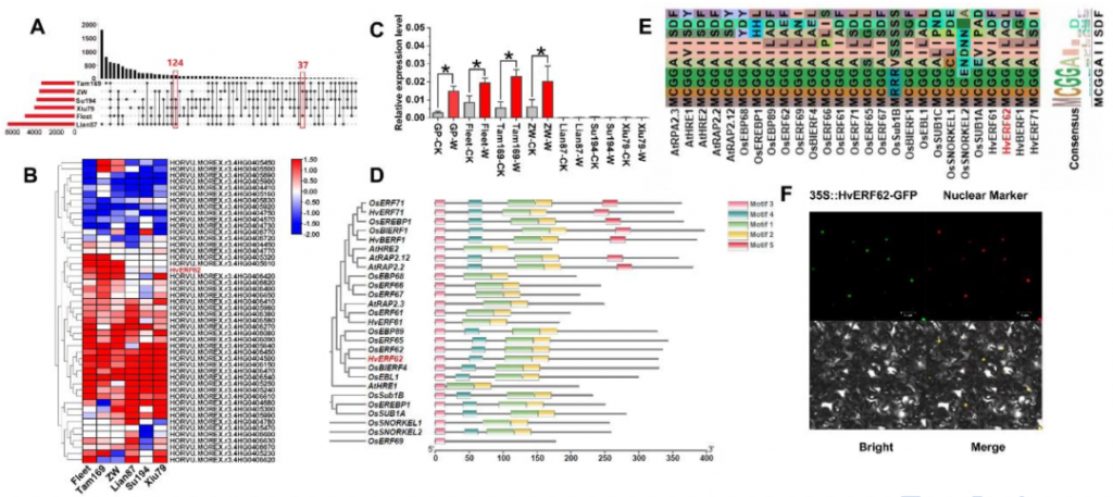 對(duì)3個(gè)耐漬澇材料(Fleet、Tam169、ZW)和3個(gè)漬澇敏感材料(Lian87、Su194、Xiu79)進(jìn)行轉(zhuǎn)錄組測(cè)序(RNA-seq)分析。通過比較不同材料在正常和漬澇條件下的基因表達(dá)差異,發(fā)現(xiàn)在3個(gè)耐漬澇材料中,位于4H染色體QTL區(qū)間內(nèi)的 HvERF62 基因受漬澇脅迫顯著誘導(dǎo)表達(dá),而在3個(gè)漬澇敏感材料中,該基因表達(dá)量較低(圖3B, 3C)。