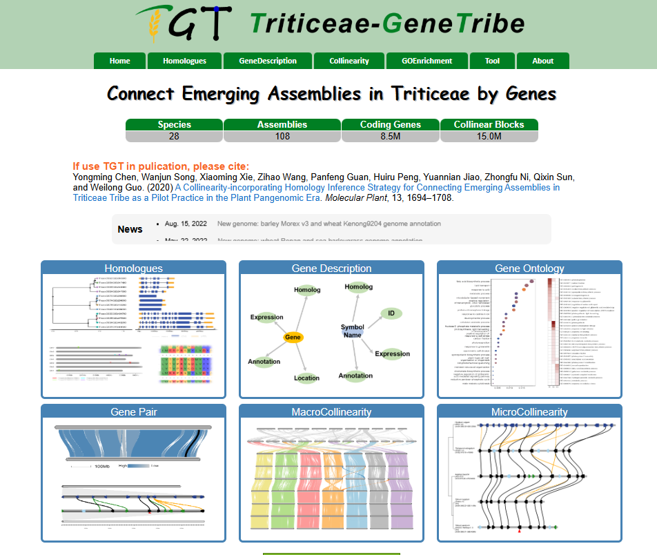 ☆?小麥族同源基因數(shù)據(jù)庫TriticeaeGeneTribe:利用小麥族物種中已發(fā)表的基因組,對(duì)不同參考基因組間同源基因鑒定,構(gòu)建了小麥族同源基因數(shù)據(jù)庫。同時(shí),數(shù)據(jù)庫具有基因功能查詢,GO富集分析,同源基因查詢,基因組區(qū)間共線性分析等功能。