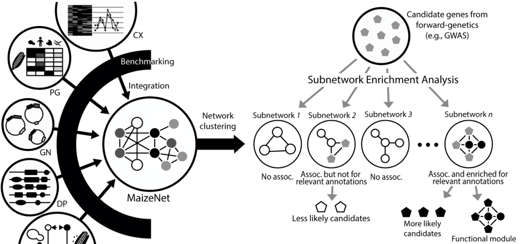 ☆?全基因組范圍的玉米基因輔助功能網(wǎng)絡(luò)數(shù)據(jù)庫MaizeNet:是通過集成?21?個(gè)組件網(wǎng)絡(luò)構(gòu)建的,其中每個(gè)網(wǎng)絡(luò)都是從不同的組學(xué)數(shù)據(jù)中推斷出來的。 通過整合異構(gòu)數(shù)據(jù),MaizeNet?提供了玉米遺傳結(jié)構(gòu)的全面視圖,為特定生物過程確定候選基因的優(yōu)先級(jí)??梢岳?MaizeNet?中實(shí)現(xiàn)的優(yōu)先級(jí)服務(wù)來生成新的功能假設(shè),縮小候選基因的范圍,并確定該功能的新基因。