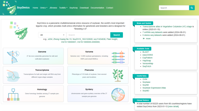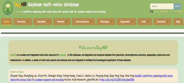 ☆?大豆多組學(xué)數(shù)據(jù)庫SoyOmics:從基因組、變異組、轉(zhuǎn)錄組、表型組等不同層面整合了大豆相關(guān)數(shù)據(jù)集,實(shí)現(xiàn)了不同層次組學(xué)數(shù)據(jù)的交互查詢和聯(lián)合比較分析。數(shù)據(jù)庫目前收錄了多個(gè)大豆品系的基因組組裝,注釋數(shù)據(jù),以高質(zhì)量的ZH13作為參考基因組,對(duì)2898份材料的全基因組測序數(shù)據(jù)進(jìn)行了全基因組序列變異檢測,鑒定到約3800萬條SNP/INDEL變異數(shù)據(jù),提供了來自大豆泛基因組分析的約55萬條結(jié)構(gòu)變異數(shù)據(jù)以及基于結(jié)構(gòu)變異構(gòu)建的圖泛基因組。收錄了多個(gè)品系不同組織時(shí)期的表達(dá)數(shù)據(jù)。數(shù)據(jù)庫針對(duì)115個(gè)表型多年多點(diǎn)測定的約2.7萬條表型記錄進(jìn)行了本體注釋和歸類,并將表型數(shù)據(jù)與變異數(shù)據(jù)進(jìn)行關(guān)聯(lián)。除以上組學(xué)數(shù)據(jù)外,數(shù)據(jù)庫同時(shí)提供了甲基化測序數(shù)據(jù),Soy40K大豆芯片數(shù)據(jù)。