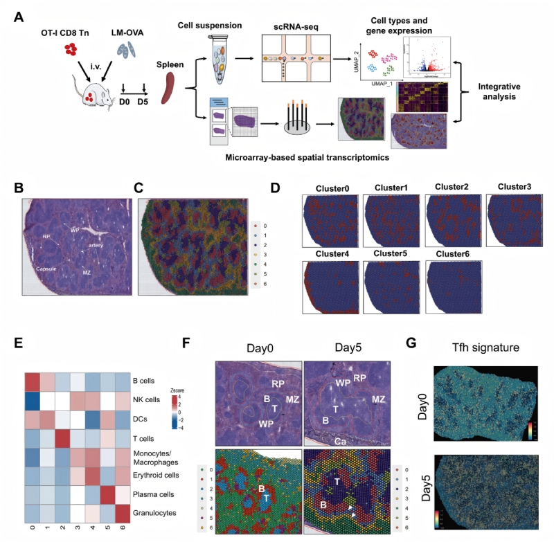 為了研究免疫反應過程中不同免疫細胞的空間分布和CD8+?T細胞分化的調(diào)節(jié)機制,研究人員通過整合單細胞RNA測序(scRNA-seq)和BMKMANU?S1000空間轉(zhuǎn)錄組(ST)技術(shù),分析了急性感染模型中脾臟免疫細胞的空間分布與CD8??T細胞分化機制。實驗采用OT-I轉(zhuǎn)基因小鼠模型,通過李斯特菌(LM-OVA)感染誘導免疫反應,關(guān)鍵發(fā)現(xiàn)包括:1)脾臟形成7個功能集群(B細胞、T細胞、單核/巨噬細胞等);2)感染后T/B細胞區(qū)擴大,APCs(B細胞、DC、巨噬細胞)在T細胞區(qū)外圍聚集;3)空間重組與T細胞分化(MP/TE亞群)顯著相關(guān)。多組學整合揭示了免疫微環(huán)境的動態(tài)調(diào)控機制,為理解感染中細胞互作提供了多組學視角。