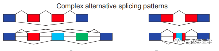 基因轉(zhuǎn)錄生成的前體mRNA(pre-mRNA),有多種剪接方式,選擇不同的外顯子,產(chǎn)生不同的成熟mRNA,從而翻譯為不同的蛋白質(zhì),構(gòu)成生物性狀的多樣性。這種轉(zhuǎn)錄后的mRNA加工過(guò)程稱為可變剪接或選擇性剪接(Alternative splicing)。可變剪接類型包括:(A) 外顯子跳躍;(B) 可變轉(zhuǎn)錄終止位點(diǎn);(C) 可變外顯子;(D)可變轉(zhuǎn)錄起始位點(diǎn);(E) 內(nèi)含子保留。