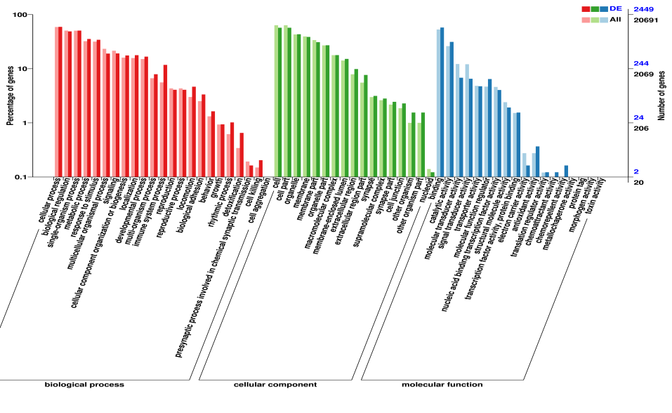 GO注釋分類統(tǒng)計(jì)圖,直觀的反映出在生物過(guò)程(biological process)、細(xì)胞組分(cellular component)和分子功能(molecular function),可深入挖掘差異基因和轉(zhuǎn)錄本的功能及所在的信號(hào)通路,篩選關(guān)注差異基因和轉(zhuǎn)錄本注釋情況。