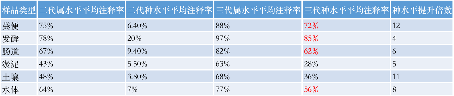 我們對(duì)不同類型的樣品如:土壤、糞便、腸道、水體等,隨機(jī)挑選了30個(gè)項(xiàng)目對(duì)其進(jìn)行物種注釋率進(jìn)行研發(fā)優(yōu)化,目前采用優(yōu)化數(shù)據(jù)庫(kù)及注釋方法的策略,將其種水平平均注釋率提升到60%+。二代注釋到屬和種的平均比例為78%和6%,相同樣品采用三代進(jìn)行注釋時(shí),屬和種水平平均注釋率為95%和60%,注釋結(jié)果提升非常明顯。